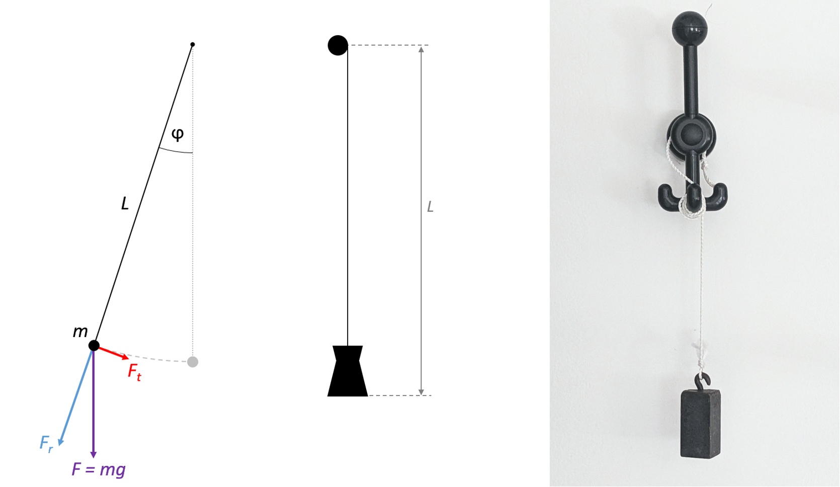 Abbildung 1: Schematische Darstellung und experimenteller Aufbau des Fadenpendels mit markierter Pendellänge L und den wirkenden Kräften. Rechts ist die praktische Realisierung mit Aufhängung und Gewicht gezeigt.